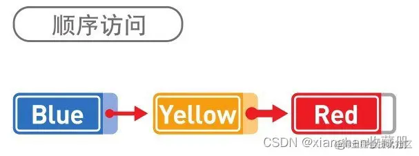 因为数据都是分散存储的,所以如果想要访问数据,只能从第1个数据开始,顺着指针的指向一一往下访问(这便是顺序访问)。比如,想要找到Red这一数据,就得从Blue开始访问。