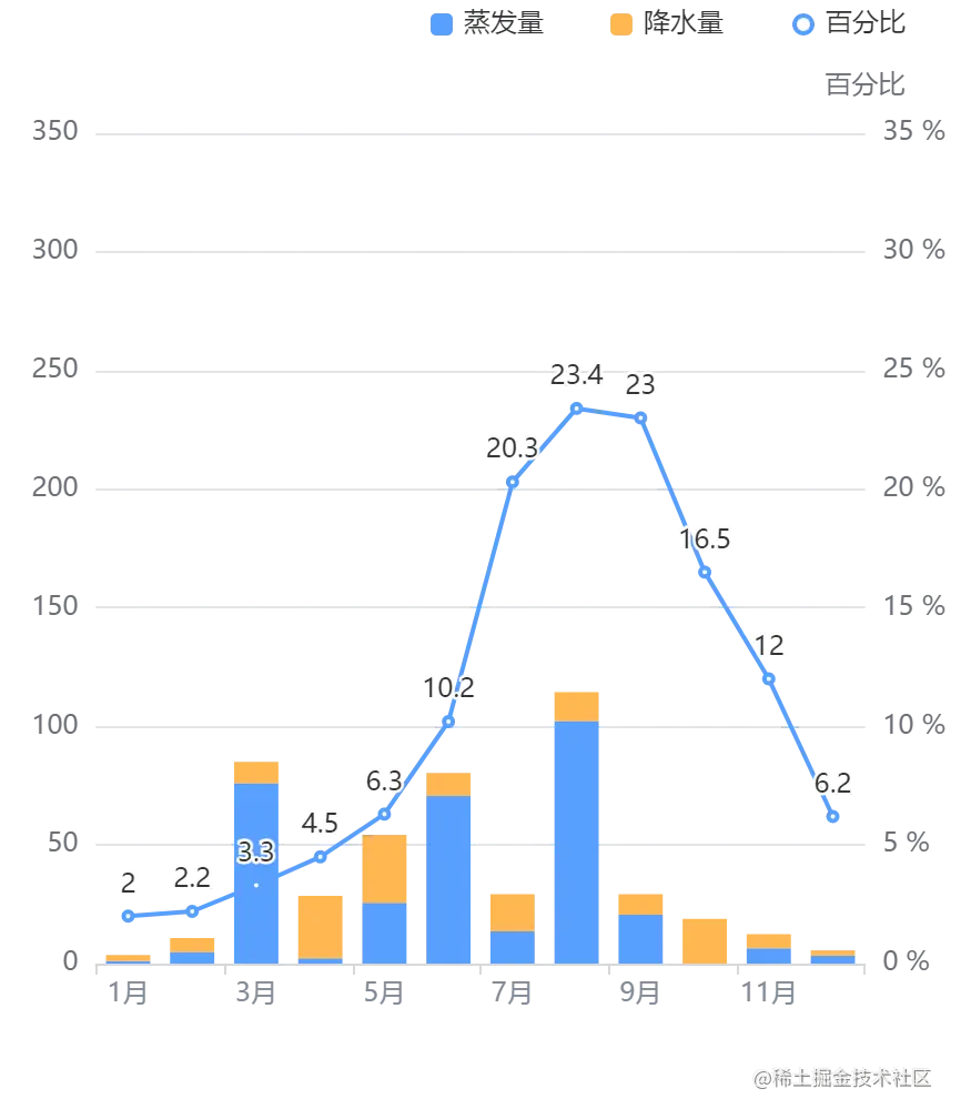 // 折注混合,X轴的颜色,X轴字体颜色,调整柱子颜色,调整小图标图例的大小和位置,鼠标hover时候的样式,用纵向阴影