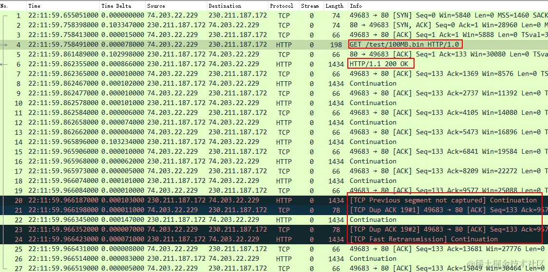 所以感觉像是 Wireshark 判断为快速重传确实合情合理,但是细细一琢磨,会发现里面有些问题:IRTT,IRTT 为 0.103362s ,说明客户端和服务器端 RTT 约为 103ms,如果捕获点在客户端,No.24 和 No.23 之间的时间差值仅为 71ns。试问从客户端发出 No.23 到服务器收到 No.23 之后触发快速重传,再到客户端所捕获,这个 71ns 的时间完全不符合现实。