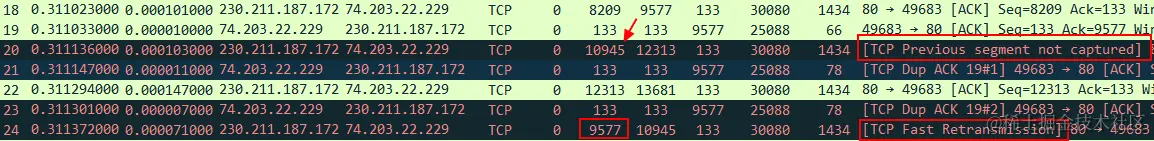 - 服务器所发的数据包 No.20 前因为没有 TCP 分段 Seq 9577 ,所以 No.20 标记为