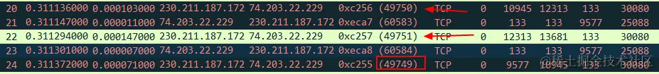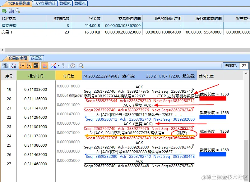 也可以利用 IP.ID 加以佐证,No.24 的 IP ID 为 49749 ,在 No.20 和 No.22 之前,因此乱序无疑。