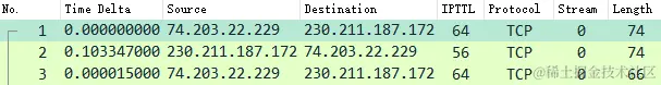 - IRTT,IRTT 为 0.103362s ,从 TCP 三次握手 SYN-SYN/ACK-ACK 的时间差值,初步判断捕获点为客户端或靠近客户端的地方;