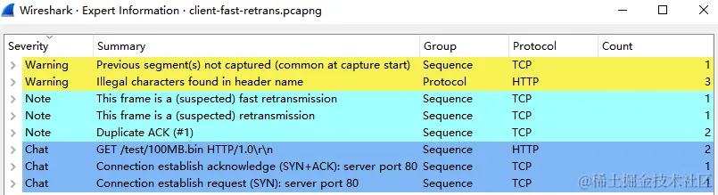 因为跟踪文件数据包数量总共就 27 个,专家信息所显示的一些问题像是重传或是快速重传的数量也就只 1 个。