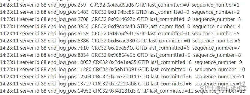 可以发现MySQL 5.7二进制日志较之原来的二进制日志内容多了last_committed和sequence_number,last_committed表示事务提交的时候,上次事务提交的编号,如果事务具有相同的last_committed,表示这些事务都在一组内,可以进行并行的回放。