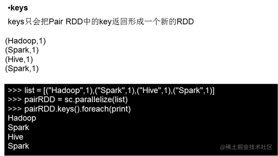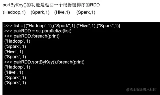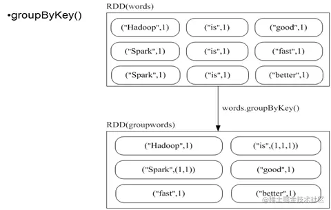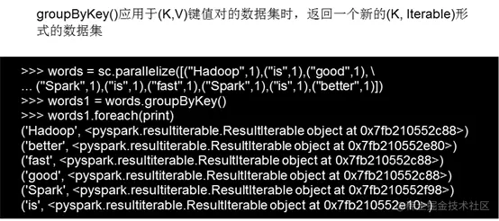 groupByKey也是对每个key进行操作,但只生成一个sequence,groupByKey本身不能自定义函数,需要先用groupByKey生成RDD,然后才能对此RDD通过map进行自定义函数操作