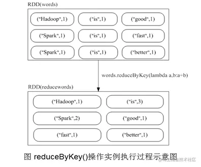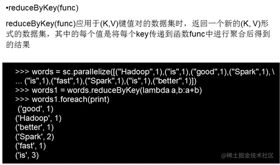reduceByKey用于对每个key对应的多个value进行merge操作,最重要的是它能够在本地先进行merge操作,并且merge操作可以通过函数自定义