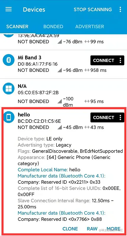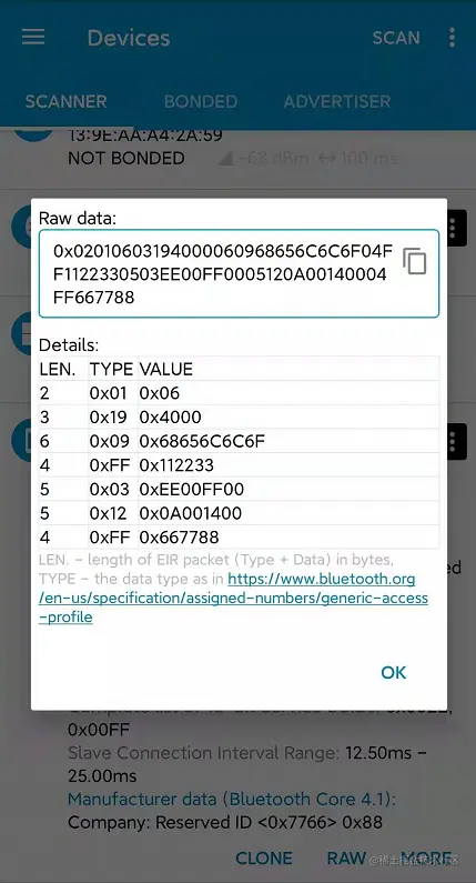 这里广播了两个 16bite UUID:0x00EE、0x00FF