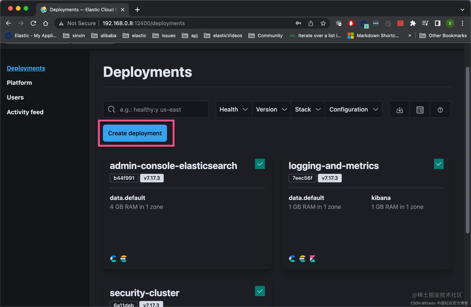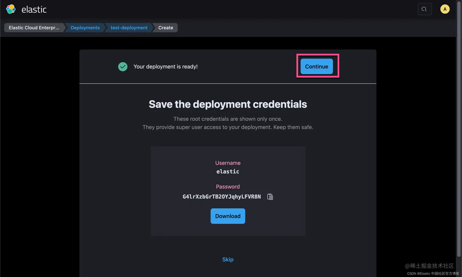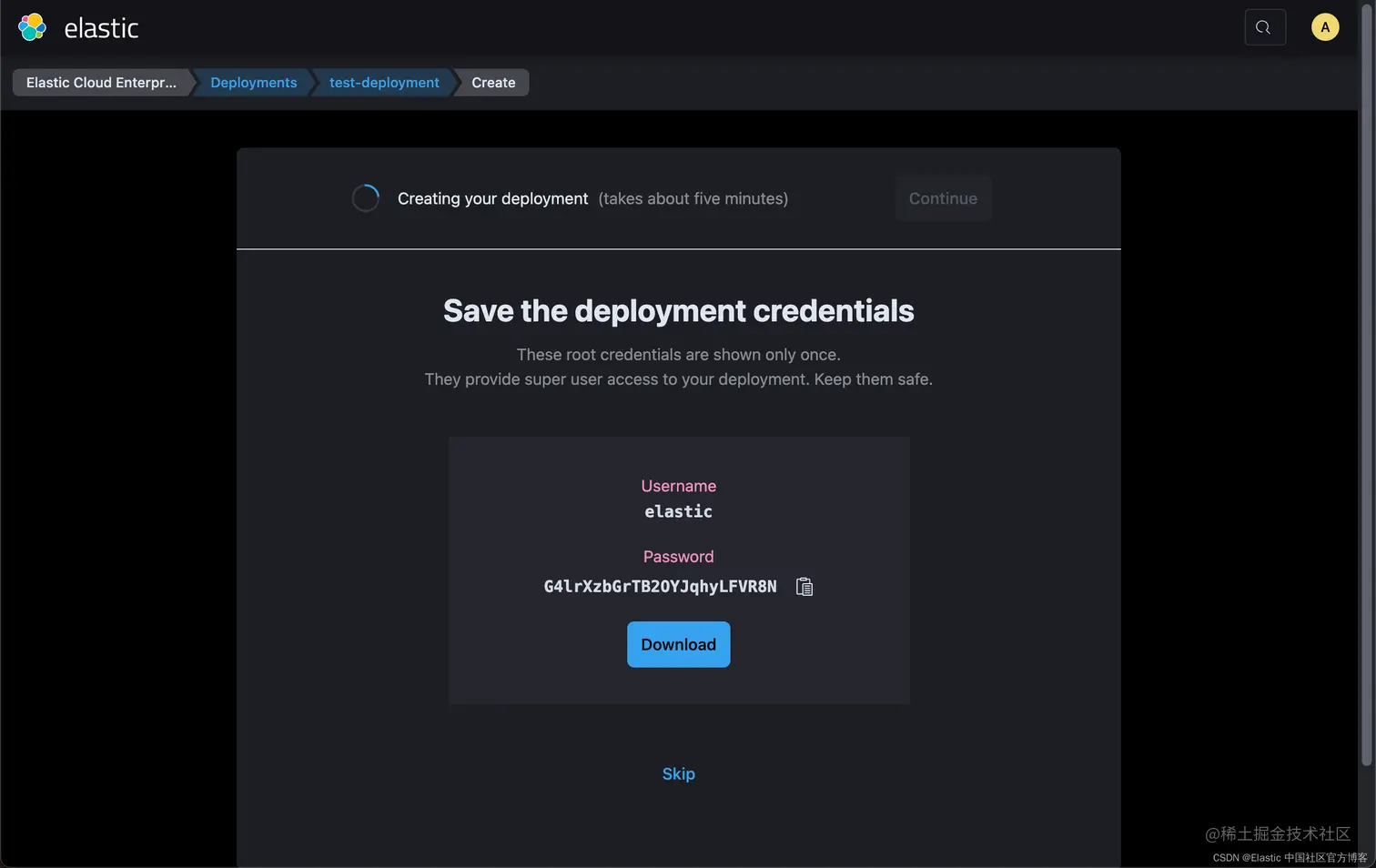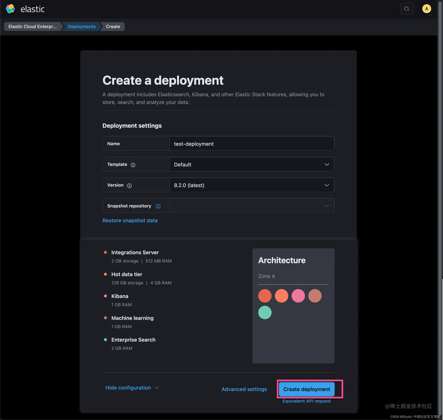 我们选择上面的 Create deployment 来创建一个最新的 Elasticsearch 集群: