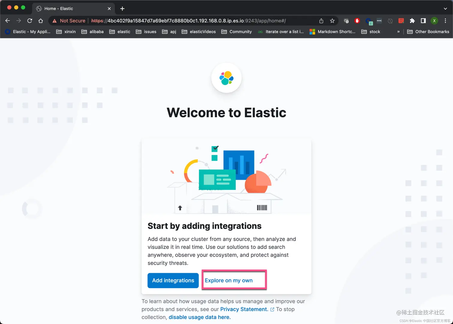 如上所示,我们的 Kibana 已经被成功地启动起来了。点击上面的 Explore on my own 链接: