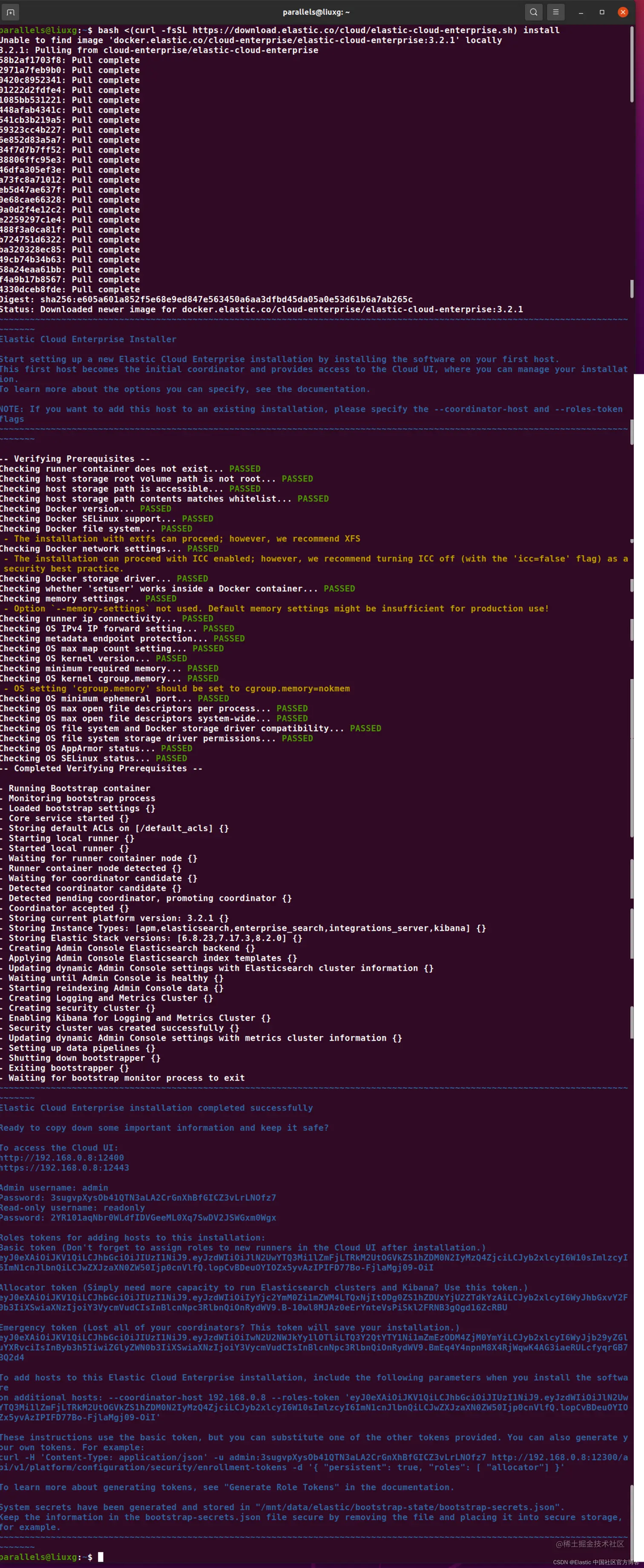 警告:在安装期间,系统会生成放入 /mnt/data/elastic/bootstrap-state/bootstrap-secrets.json 机密文件的 secrets,除非你使用 --host-storage-path 参数传入不同的路径。 通过将 bootstrap-secrets.json 文件中的信息从其默认位置移除并将其放入安全的存储位置,以确保信息的安全。