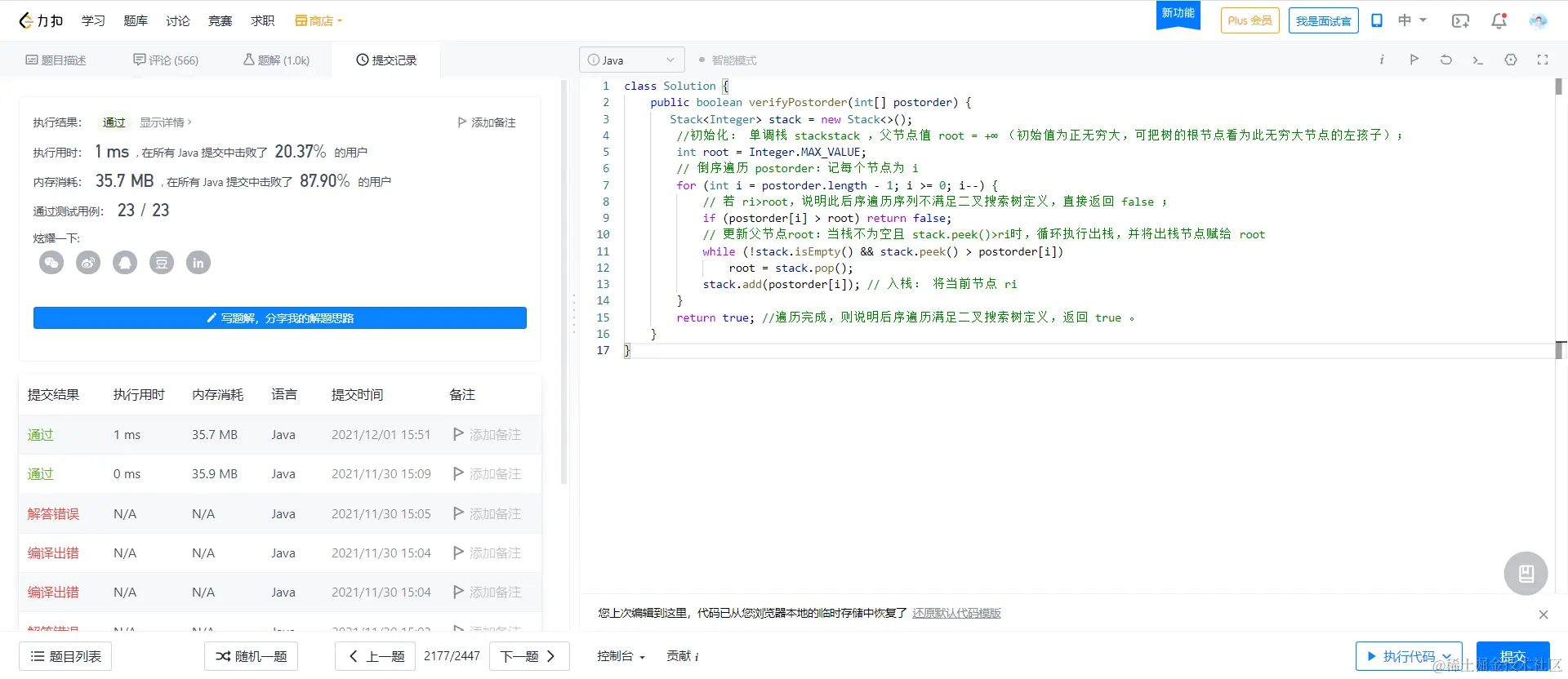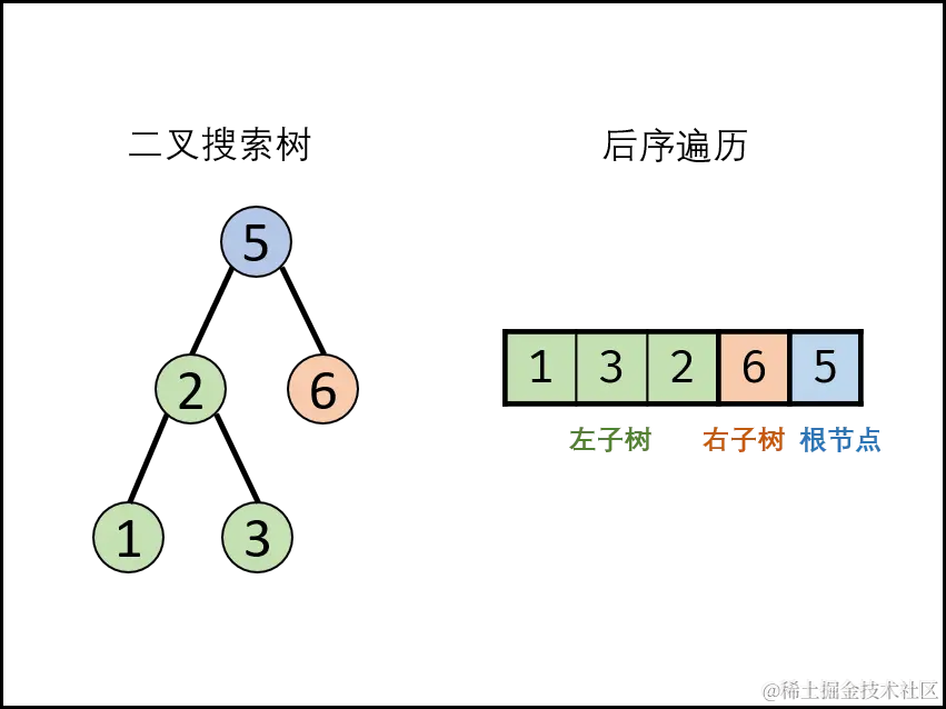 - 右子树区间[m,j- 1]内的所有节点都应> postorder[j] 。实现方式为遍历,当遇到≤ postorder[j] 的节点则跳出;则可通过 p = j 判断是否为二叉搜索树。