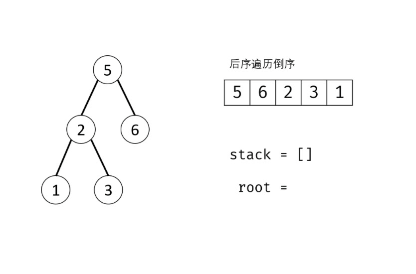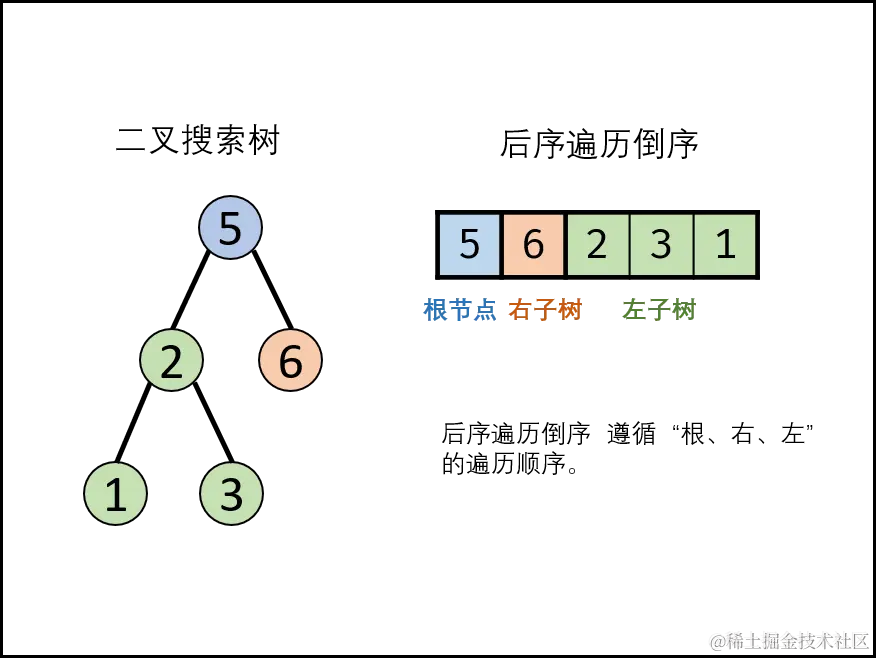 后序遍历 倒序: [ 根节点 | 右子树 | 左子树 ] 。类似 先序遍历的镜像 ,即先序遍历为 “根、左、右” 的顺序,而后序遍历的倒序为 “根、右、左” 顺序。