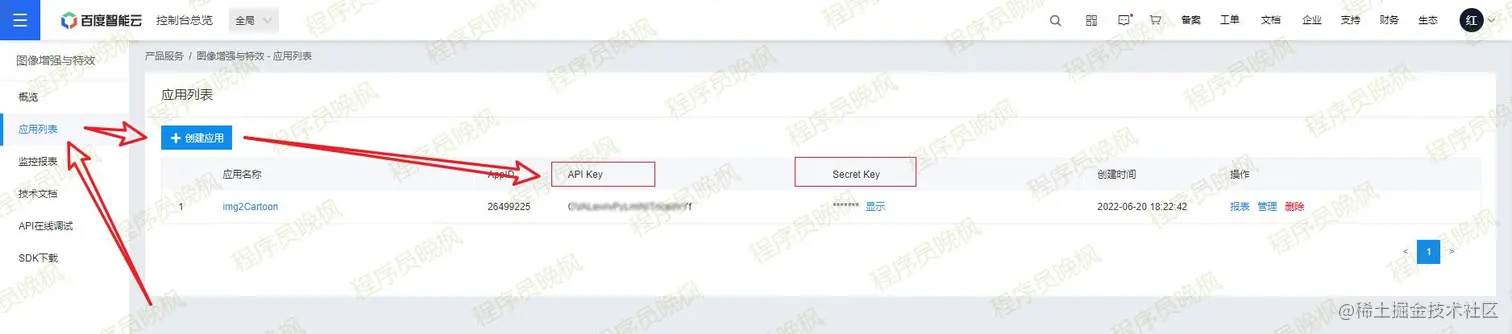 开通免费试用很简单,打开百度AI平台,找到:人像动漫化这个功能,然后创建自己的应用,复制下图中的2个信息到你自己的代码里就可以了。如果不知道百度AI平台的链接,大家可以评论区提问(文章里不能放链接,容易审核不通过🐕)。