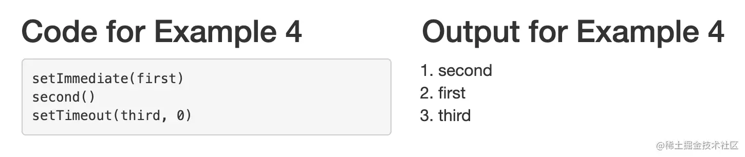 正如你从输出中看到的,这个例子中的函数是按照这个顺序执行的。first,third,second 。所以在我们的例子中,由setImmediate 预定的回调在由setTimeout 预定的回调之前被执行。