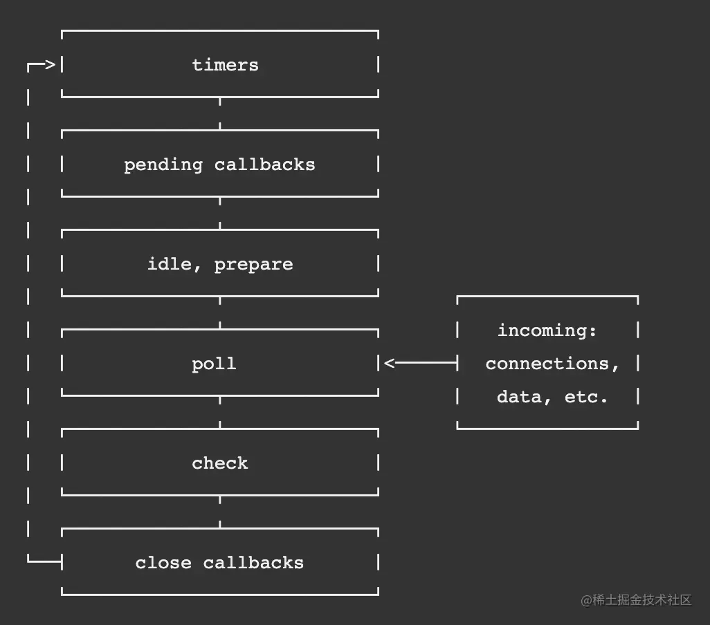 正如你所看到的,Node.js事件循环有六个主要阶段。让我们简单地看看每个阶段会发生什么。