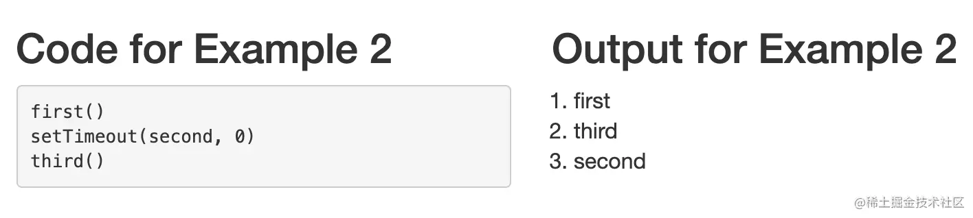要理解的第二个关键原则是,使用setTimeout ,将回调安排在稍后的时间执行,这将总是至少在事件循环的下一次迭代中。所以在这个事件循环的第一次迭代中,first 函数被执行,second 函数被安排,third 函数被执行。然后,在事件循环的第二次迭代中,已经达到了0毫秒的最小延迟,所以在第二次迭代的 "定时器 "阶段执行了second 。