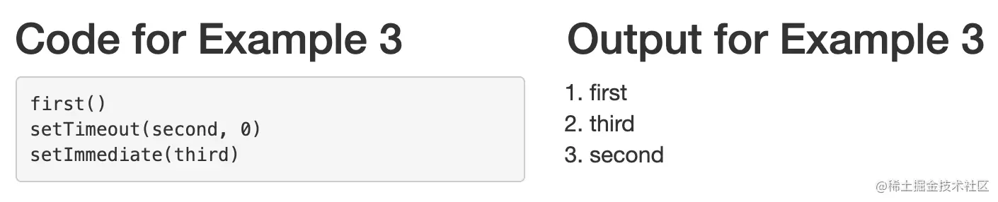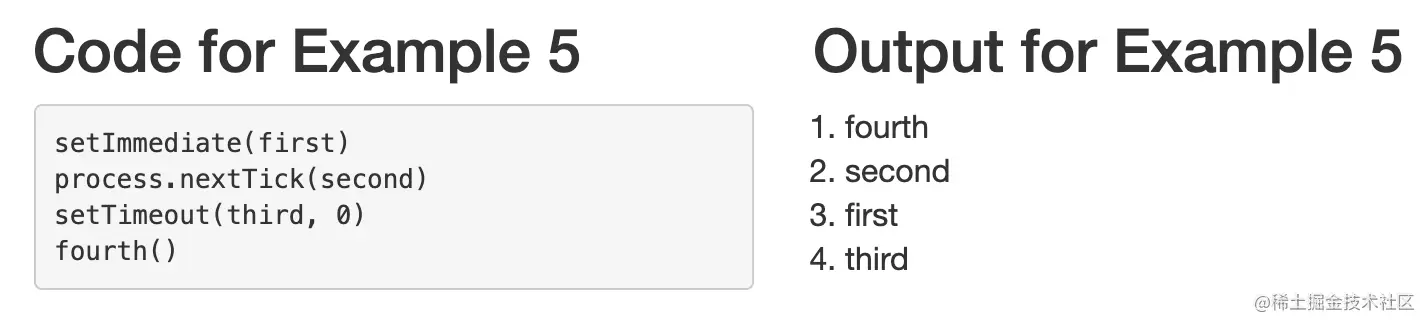 正如你从输出中看到的,这个例子中的函数是按照这个顺序执行的。first,third,second 。所以在我们的例子中,由setImmediate 预定的回调在由setTimeout 预定的回调之前被执行。