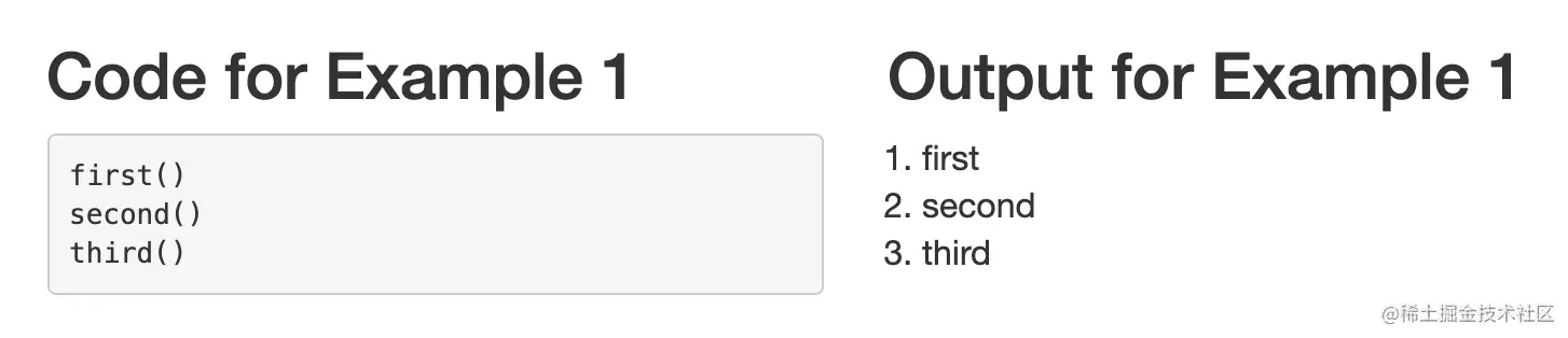 这里我们有三个同步函数,一个接一个地被调用。因为这些函数都是同步的,代码只是从上到下执行。因此,因为我们按照first,second,third 的顺序调用我们的函数,所以这些函数也是按照同样的顺序执行。first,second,third 。