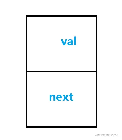 下图是一个单链表的节点, 其中val域存储的是当前节点的值, next域存储的是指向下一个节点的地址即引用类型