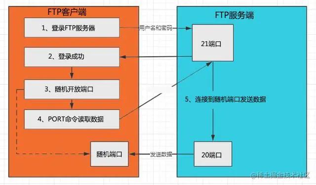 FTP客户端首先和FTP服务器的TCP21端口建立连接,通过这个通道发送命令,客户端需要接收数据的时候在这个通道上发送PORT命令。 PORT命令包含了客户端用什么端口接收数据。在传送数据的时候,服务器端通过自己的TCP 20 端口连接至客户端的指定端口发送数据。