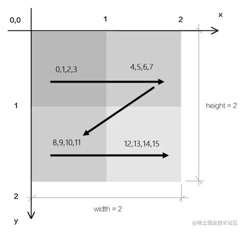 - data:Uint8ClampedArray [0,1,2,3, 4,5,6,7,8,9,10,11,12,13,14,15]