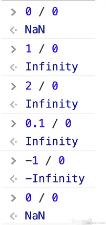 Infinity 总是等于另一个 Infinity,所以 1/0 === 10 ** 1000 返回 true。