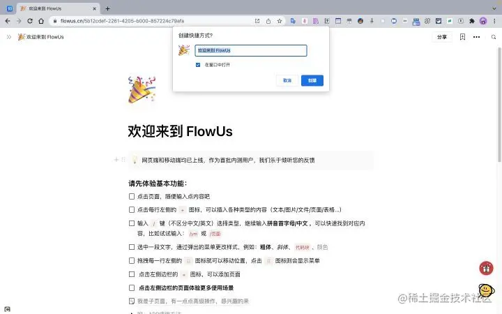3.随后在弹出的对话框中,将“在窗口中打开”进行勾选。随后,基于 Chrome 浏览器技术的 Web 应用(PWA)便会保存至你的应用程序文件夹,你也可以从应用仪表盘看见 FlowUs 的图标。