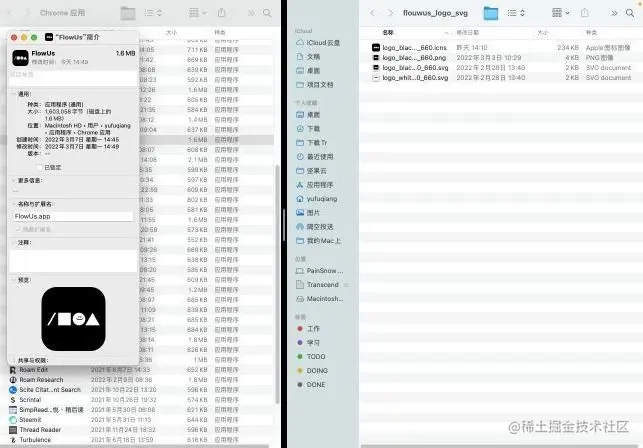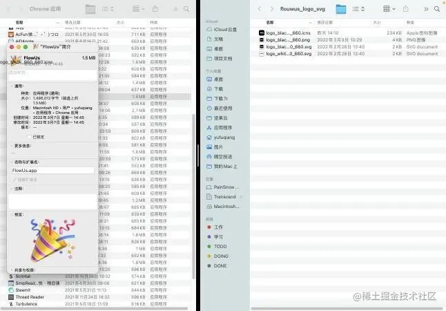 5.2 打开 Chrome 应用 程序文件夹,找到 FlowUs。使用快捷键 Command + I 打开应用简介,然后直接将 ICNS 图标拖到简介左上角的图标处,便实现了图标更换。