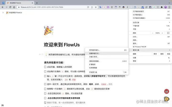 FlowUs 虽香,但是目前缺少桌面客户端。作为在线文档,是否有客户端对于我而言并不太重要。然而,为了更好地聚焦当前工作区页面,我并不想看见书签、插件或者其他标签页等分散注意力的元素。为此,我便想为 FLowUs 制作一个 Web 应用(PWA)满足我的需求。