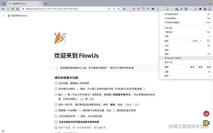 2.1 选择右上角设置,如果显示“在 FlowUs 中打开”,那么点击即可生成 Web 应用。如果没有这个显示,请按照下列流程进行操作: