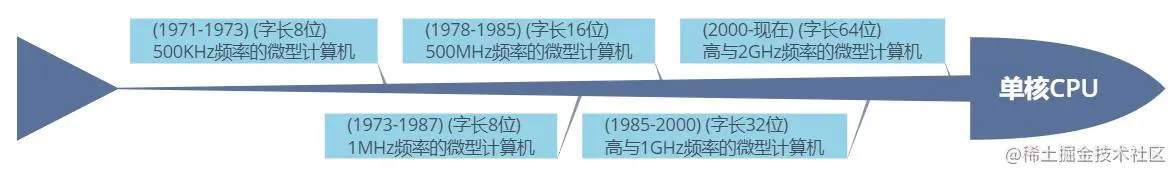 - 多核 CPU 也有字长的概念,但是在多核 CPU 时代,字长已经不是约束 CPU 性能的主要因素了。
