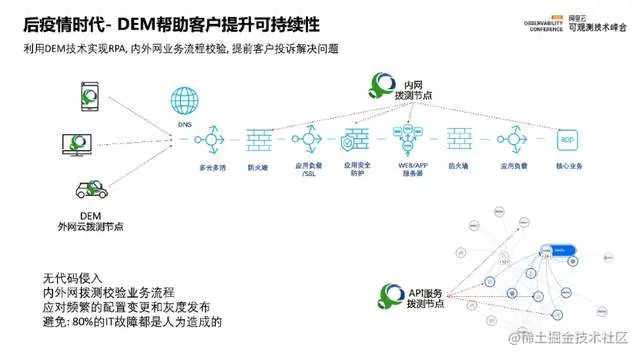 在业务方面,数字化转型对于企业而言,其实就是将IT部门转型成业务运营部门的过程。在这一过程中,提升用户体验的核心本质,就在于提升用户在系统中的留存时间,这也是数字资产的累积。而DEM(数字体验管理),正是转型的第一步,也是必经之路。