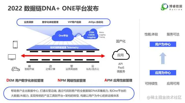 近期,博睿数据正式发布了数据链DNA+一体化智能可观测平台ONE的全新战略,帮助客户走出数据中心,打通云管边端,通过代码到客户的全数据链DNA采集能力,以及ONE平台的大数据/AI能力,实现传统的产品工具到平台+架构的转型,构建以用户为中心的新运维体系。