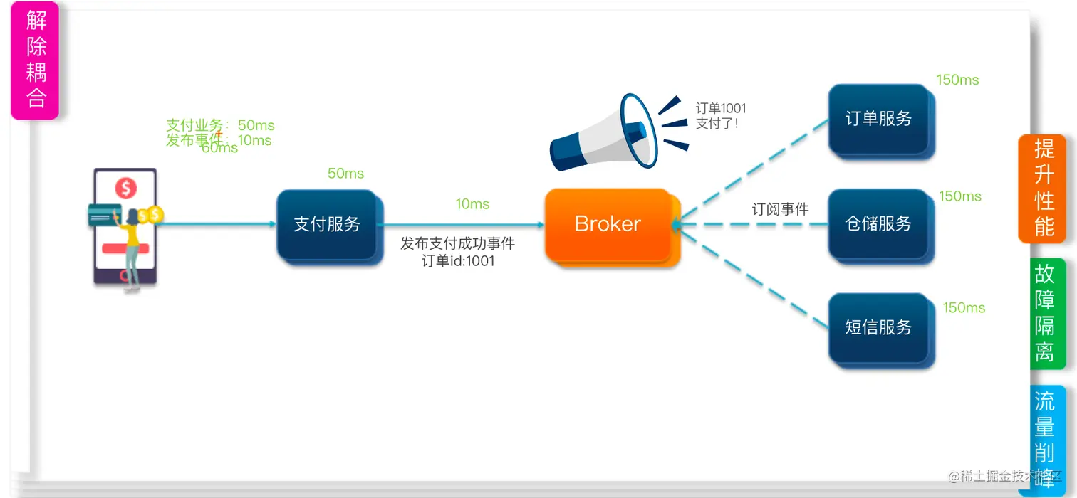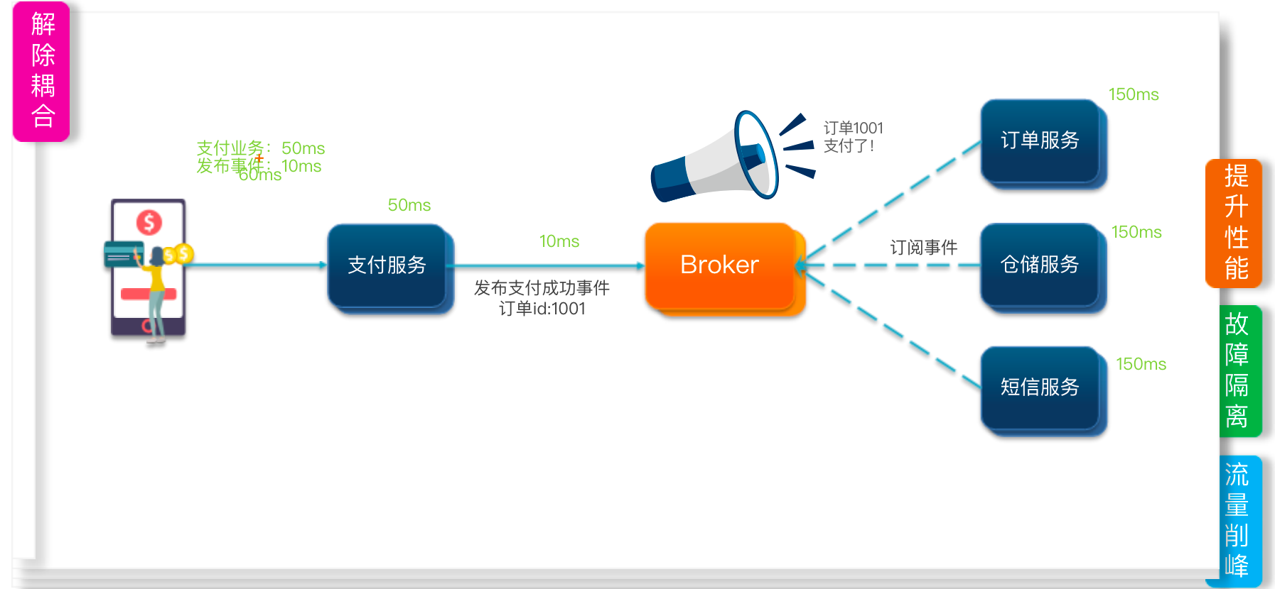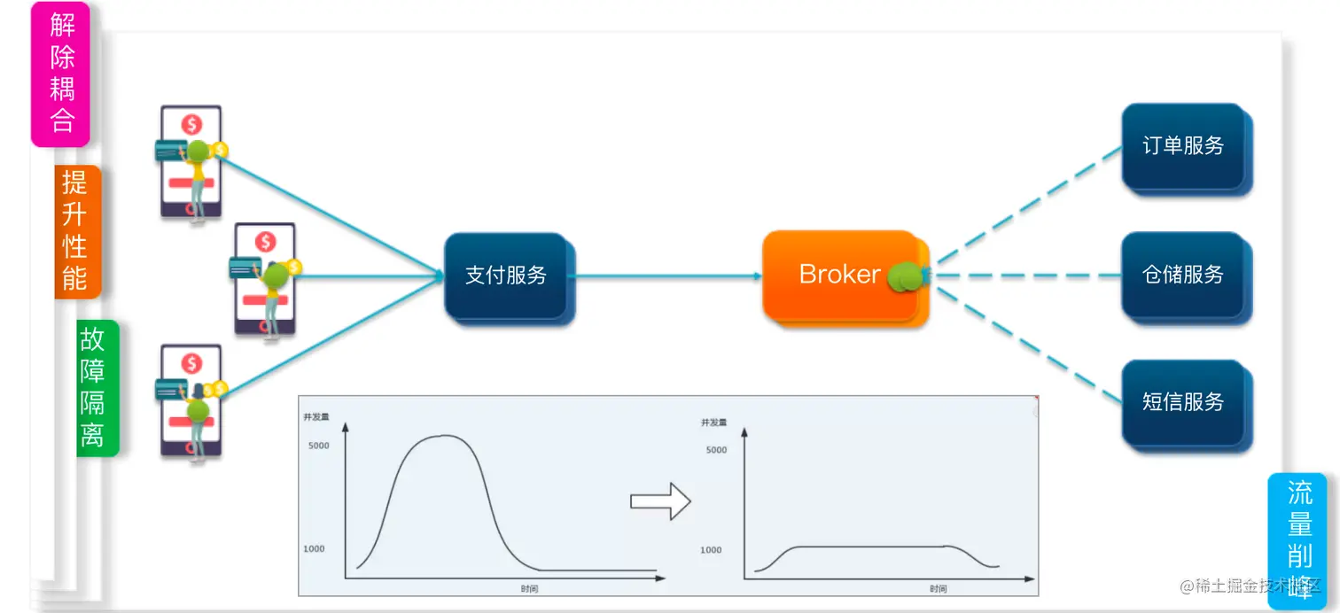 MQ (MessageQueue),中文是消息队列,字面来看就是存放消息的队列。也就是事件驱动架构中的Broker。