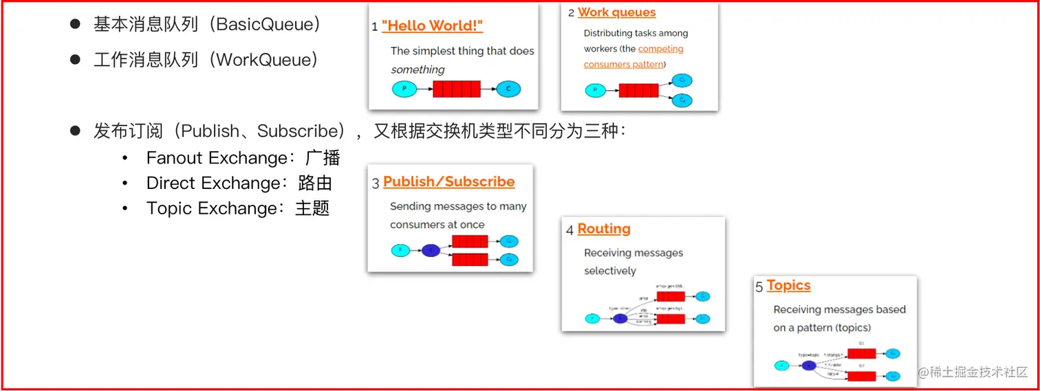 MQ的官方文档中给出了5个MQ的Demo示例,对应了几种不同的用法: