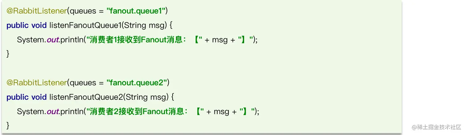 在consumer服务中,编写两个消费者方法,分别监听fanout.queue1和fanout.queue2