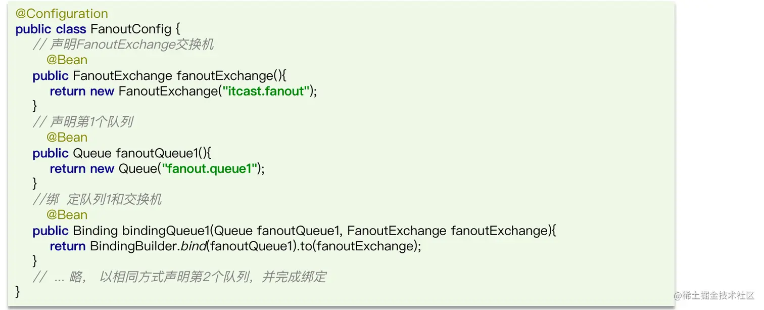 在consumer服务创建一个类,添加@Configuration注解,并声明FanoutExchange、Queue和绑定关系对象Binding,代码如下: