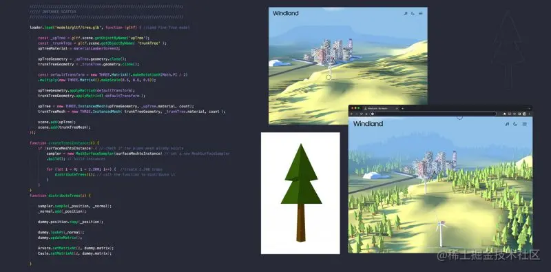 我使用Three.js中的MESH SURFACE SAMPLER创建了这些树,它正是为了这个目的。你可以使用一个模型,并将其分布在一个表面上,创建同一模型的变体,但对每个模型进行修改。因此,即使有非常多的变化,其性能也是惊人的。