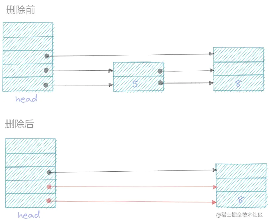 如果在单链表中执行删除操作, prev是待删除节点的前面一个节点, 如果要删除待删除节点n, 直接prev.next = n.next就完成一个节点的删除, skiplist的删除也和单链表类似。