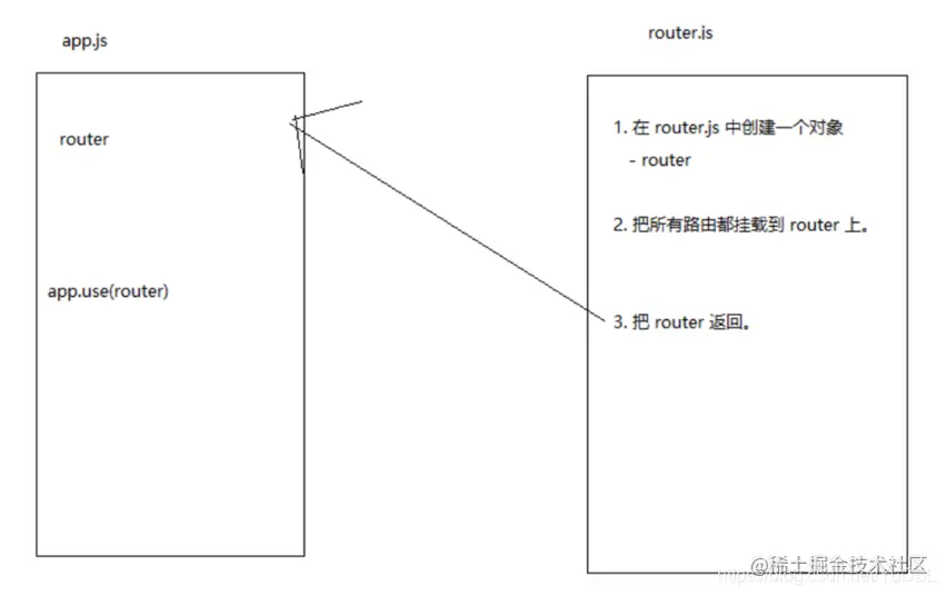 // 然后通过 app.use('/', router); 关联app对象,把 router 对象的路由表设置给 app 对象