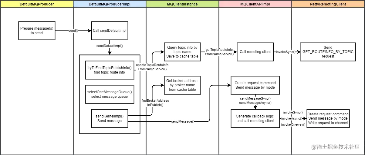 MQClientAPIImpl 负责调用 NettyRemotingClient 将生产消息的请求发往 Broker。