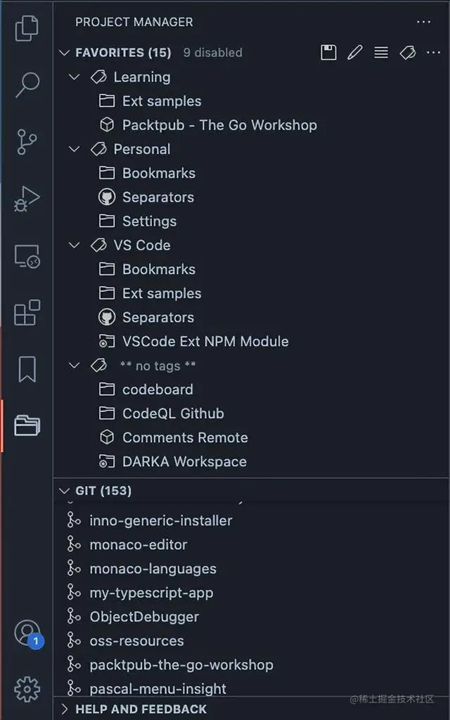 Project Manager : 它可以帮助您轻松访问您的项目,无论它们位于何处。不要再错过那些重要的项目了。您可以定义自己的项目(也称为收藏夹),或选择自动检测Git、Mercurial或SVN存储库、VSCode文件夹或任何其他文件夹。