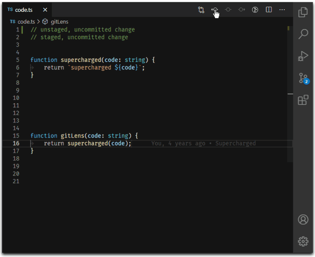GitLens - Git supercharged : GitLens 增强了VS Code 中的 Git,并解锁了每个存储库中未开发的知识。 它可以帮助您通过 Git 对比注释和 CodeLens直观地可视化代码作者身份,无缝导航和探索Git 存储库,通过丰富的可视化和强大的比较命令获得有价值的见解等等。