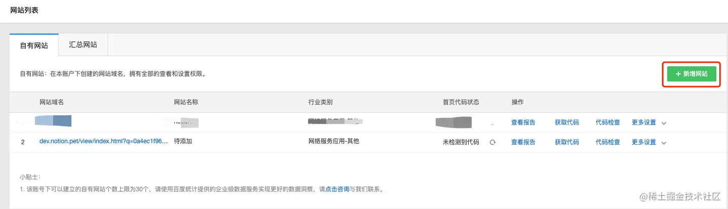 点击右上角 “新增网站” ,如下图所示