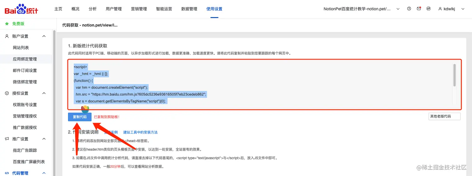 进入使用设置页面:tongji.baidu.com/main/settin…