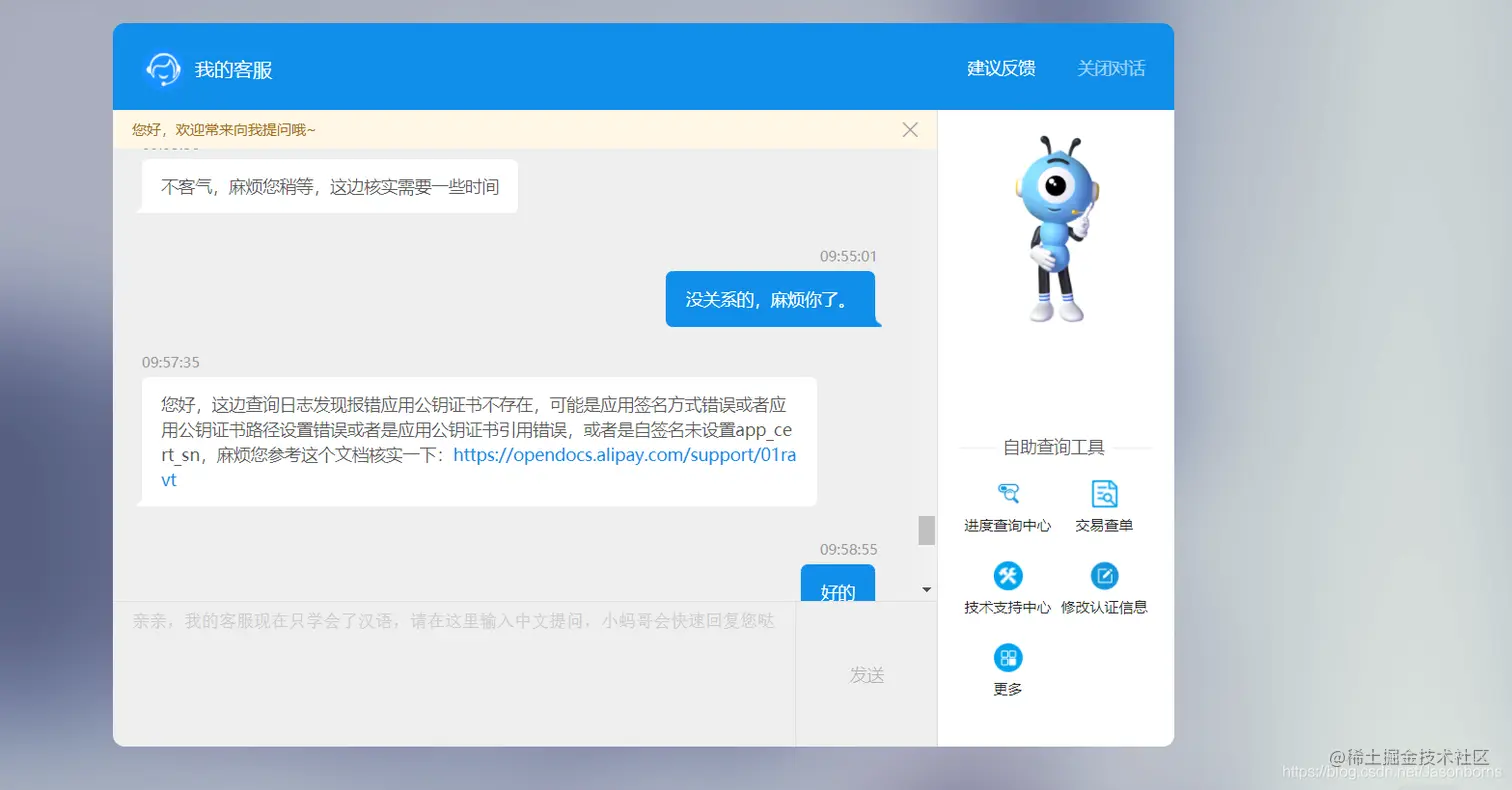 好家伙,没碰见过啊,同事说了以前测试没问题了,我就傻傻的去检查参数。对着文档检查了好几遍还是不行。于是我就直接去找客服了(我懒我可耻,轻踩)把data里参数发给客服后,客服说是商家证书的问题