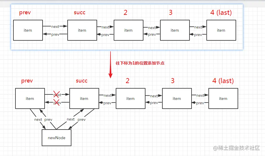 pre指向pred,next指向succ。 succ的pre指向新节点。- 如果
