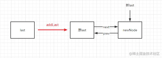 如果原尾部节点不为空,创建新节点,新节点的前置指向原来的last,原来的last的next指向新节点。