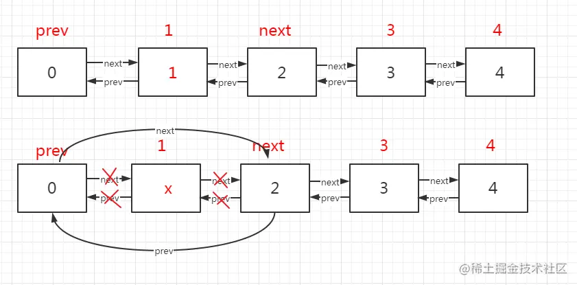 // prev的next指向next节点