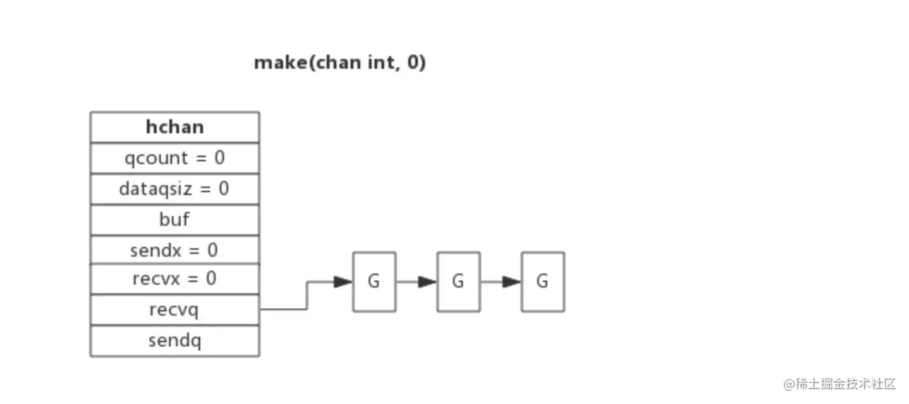 创建channel实际上是初始化hchan结构,其中类型信息和缓冲区长度由make语句传入,buf的大小与元素大小和缓冲区长度决定。